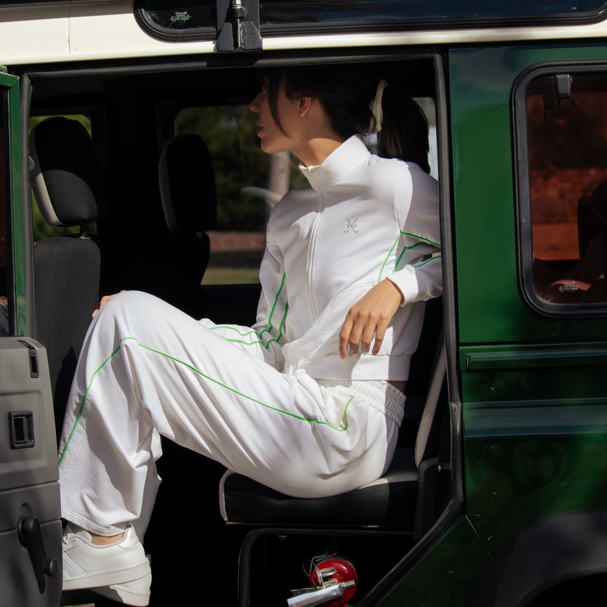 Elevate your wardrobe with the Fairway Collective Unisex Tracksuit Pants and Jacket Set. Perfect for golf, tennis, or casual wear, this off-white set features a classic 1970s-inspired green stripe for a retro yet timeless look. Designed for comfort and style, it’s ideal for both performance and relaxation.